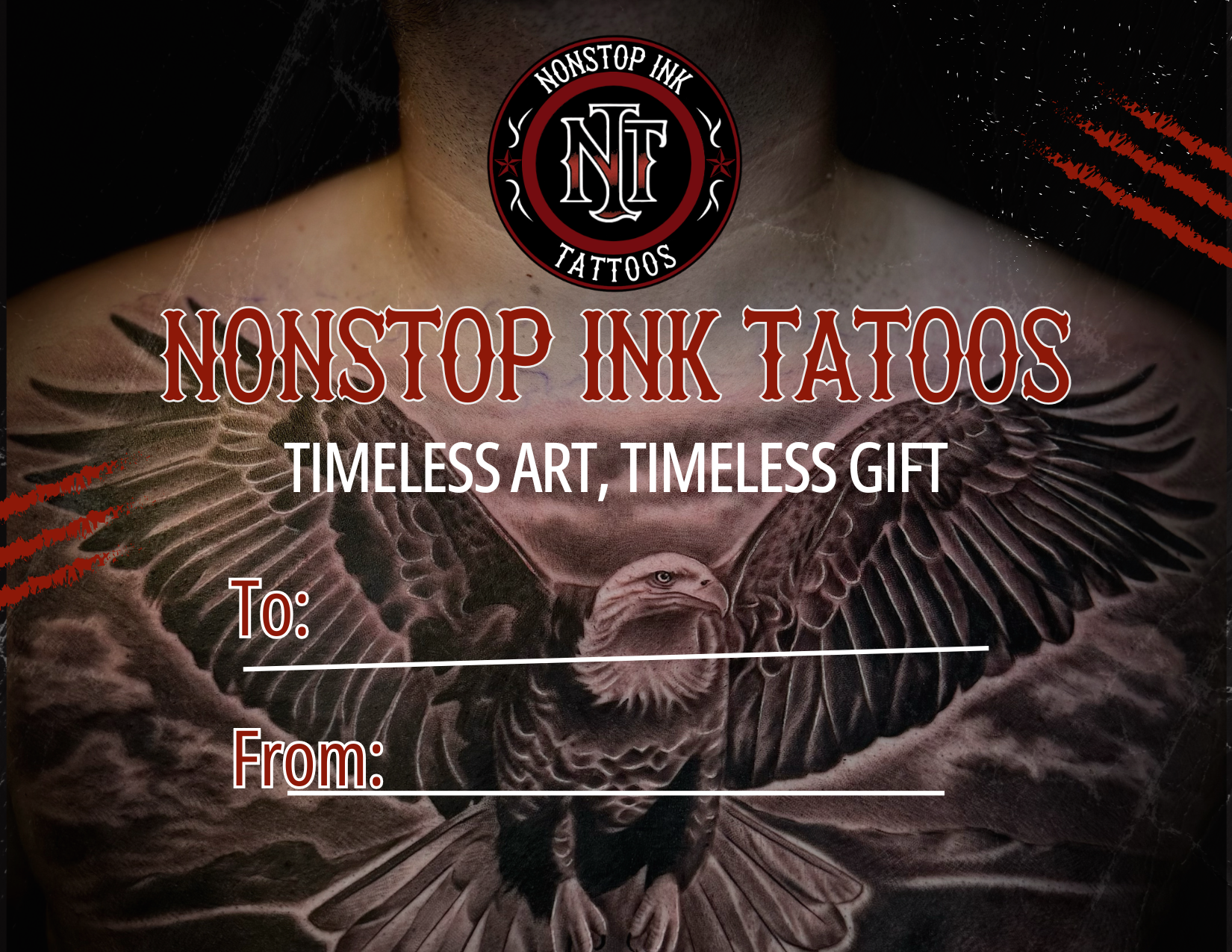 Give the perfect gift with the Nonstop Ink Tattoos Gift Card, ideal for friends, family, or yourself. Redeemable for any tattoo service or merchandise in our studio, it offers flexibility and convenience. Enjoy expert craftsmanship and creative expression with the freedom to choose the design and session that suits your style. A thoughtful and easy way to share the art of tattooing.